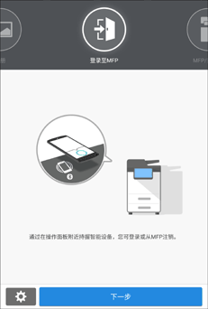 在移动设备上打开RICOH Smart Device Connector应用程序,然后向左或向右轻拂以显示登录画面。